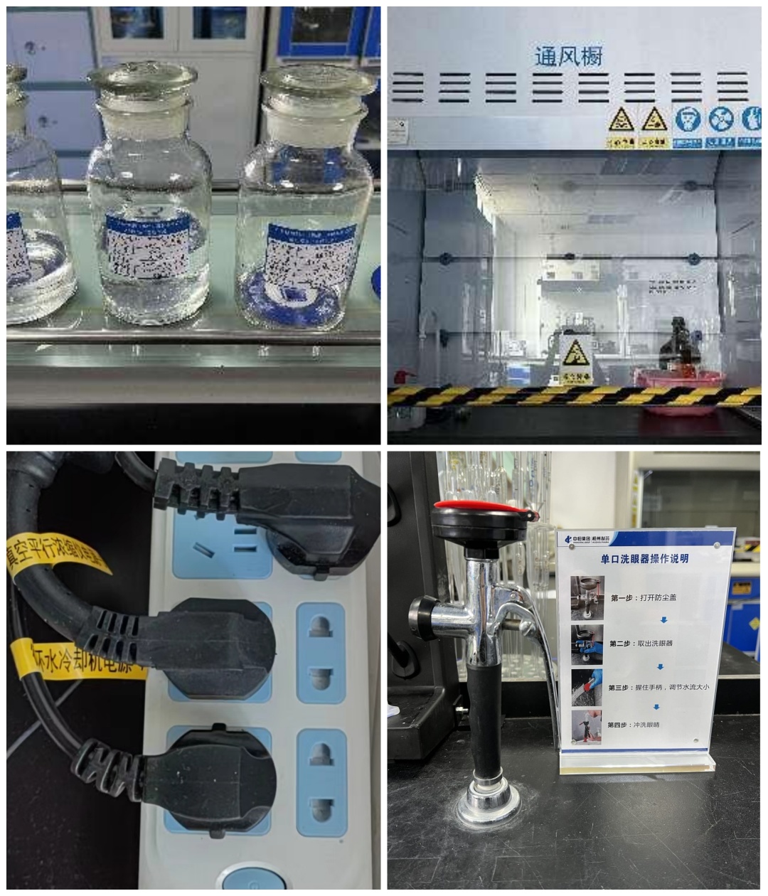 安全是企業(yè)的生命。實驗室內存放的試劑、各種檢驗操作均存在一定的風險,做好安全警示,既是保證安全檢驗,也是人員健康的一大保障。將試劑按酸(紅)、堿(黃)、普通(藍)、有毒(黑)分類標識,標識后試劑屬性及風險清晰明了。在通風櫥增加黃黑警示線及安全警示標示等,提醒人員做好安全防護。梳理管道、電源線走向與標識,在緊急狀態(tài)下能快且準地拔插頭斷電。應急處理的洗眼器旁放置操作方法標示,便于緊急狀況下的準確操作。這一系列舉措極大提高了檢驗工作的安全性。