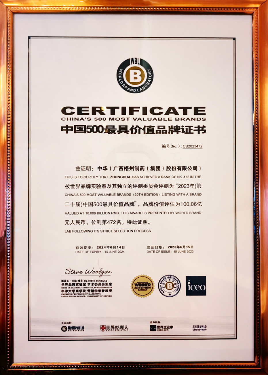 近日,由世界品牌實(shí)驗(yàn)室(World Brand Lab)主辦的第二十屆世界品牌大會(huì)在北京舉行,大會(huì)發(fā)布了2023年《中國500最具價(jià)值品牌》分析報(bào)告,廣西共有9個(gè)品牌上榜,其中,梧州制藥的“中華”品牌位列其中,成為廣西唯一入選本次榜單的醫(yī)藥品牌。品牌價(jià)值評(píng)估為100.06億元人民幣,位列榜單472位。