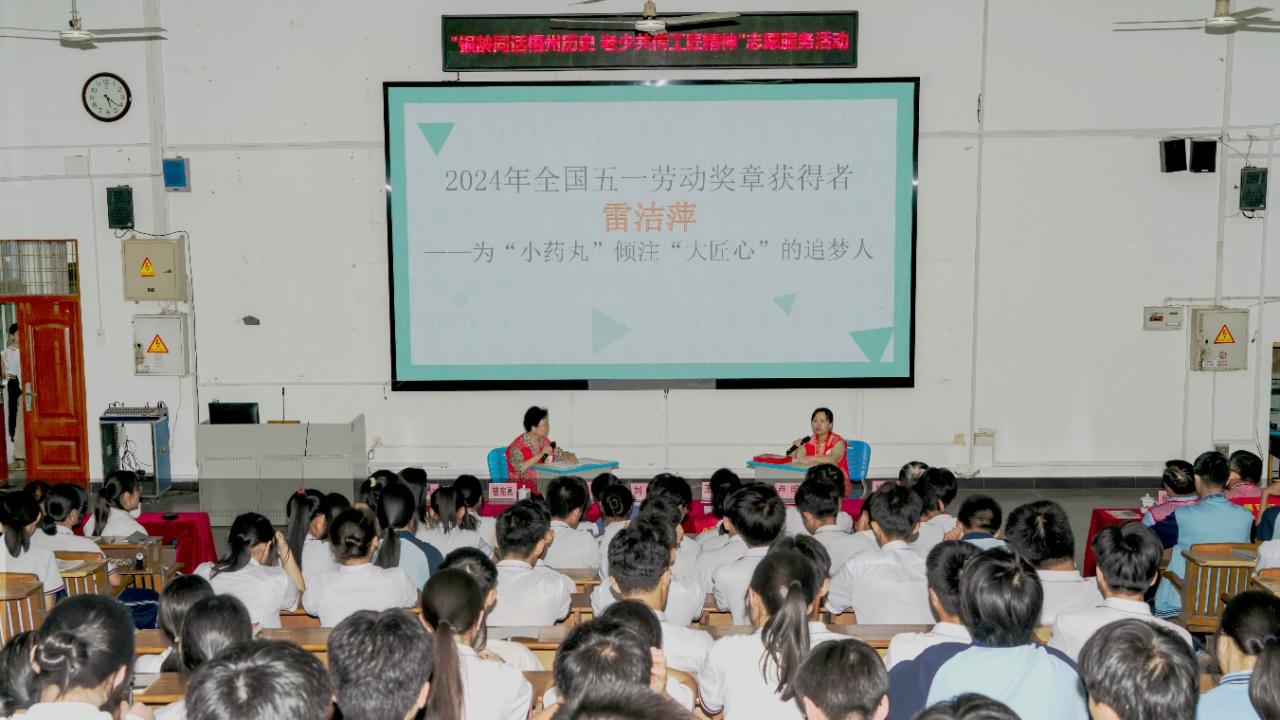 近日,在梧州市第一中學(xué),一場(chǎng)別開(kāi)生面的“巾幗勞模進(jìn)校園”開(kāi)講了,由中共梧州市委員會(huì)老干部局主辦的“銀齡同話梧州歷史 老少共傳工匠精神”志愿服務(wù)活動(dòng),梧州制藥固體車間工藝與技術(shù)主管雷潔萍受邀作為宣講代表出席活動(dòng)。
