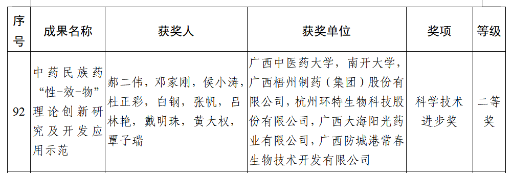 7月4日,2024年度廣西科學(xué)技術(shù)進(jìn)步獎獲獎名單正式公布,廣西梧州制藥(集團(tuán))股份有限公司參與的《中藥民族藥“性-效-物”理論創(chuàng)新研究及開發(fā)應(yīng)用示范》項(xiàng)目榮獲廣西科學(xué)技術(shù)進(jìn)步獎二等獎。獲獎項(xiàng)目由大學(xué)院校和企業(yè)聯(lián)合完成,旨在通過創(chuàng)新的理論研究,揭示中藥和民族藥的藥效物質(zhì)基礎(chǔ),提升傳統(tǒng)藥物的現(xiàn)代化水平,梧州制藥作為該項(xiàng)目的第三完成單位,彰顯了其在中藥現(xiàn)代化研究領(lǐng)域的實(shí)力。