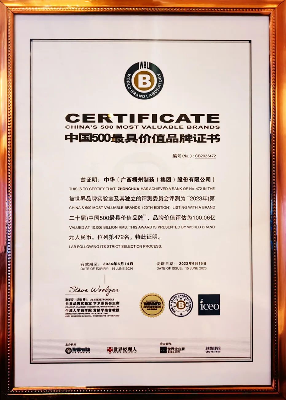 中華跌打丸為梧州制藥獨(dú)家生產(chǎn)品種,自1966年批準(zhǔn)生產(chǎn)至今已經(jīng)臨床應(yīng)用五十余年,先后收錄于2005版、2010版、2015版、2020版、2025版《中國藥典》,憑借其顯著的消腫止痛、舒筋活絡(luò)、止血生肌、活血祛瘀功效,在骨科治療領(lǐng)域深受認(rèn)可。曾獲國家醫(yī)藥管理總局優(yōu)質(zhì)產(chǎn)品獎、中華人民共和國國家質(zhì)量獎銀獎等榮譽(yù)稱號,核心發(fā)明專利榮獲中國專利優(yōu)秀獎,廣西發(fā)明創(chuàng)造成果展覽獎。其產(chǎn)品商標(biāo)是目前我國醫(yī)藥領(lǐng)域唯一一個獲準(zhǔn)使用的“中華”商標(biāo),2023年“中華”品牌入選世界品牌實(shí)驗(yàn)室發(fā)布的“中國500最具價值品牌”榜單,品牌價值評估超100億元,為當(dāng)年度廣西唯一入選該榜單的醫(yī)藥品牌。